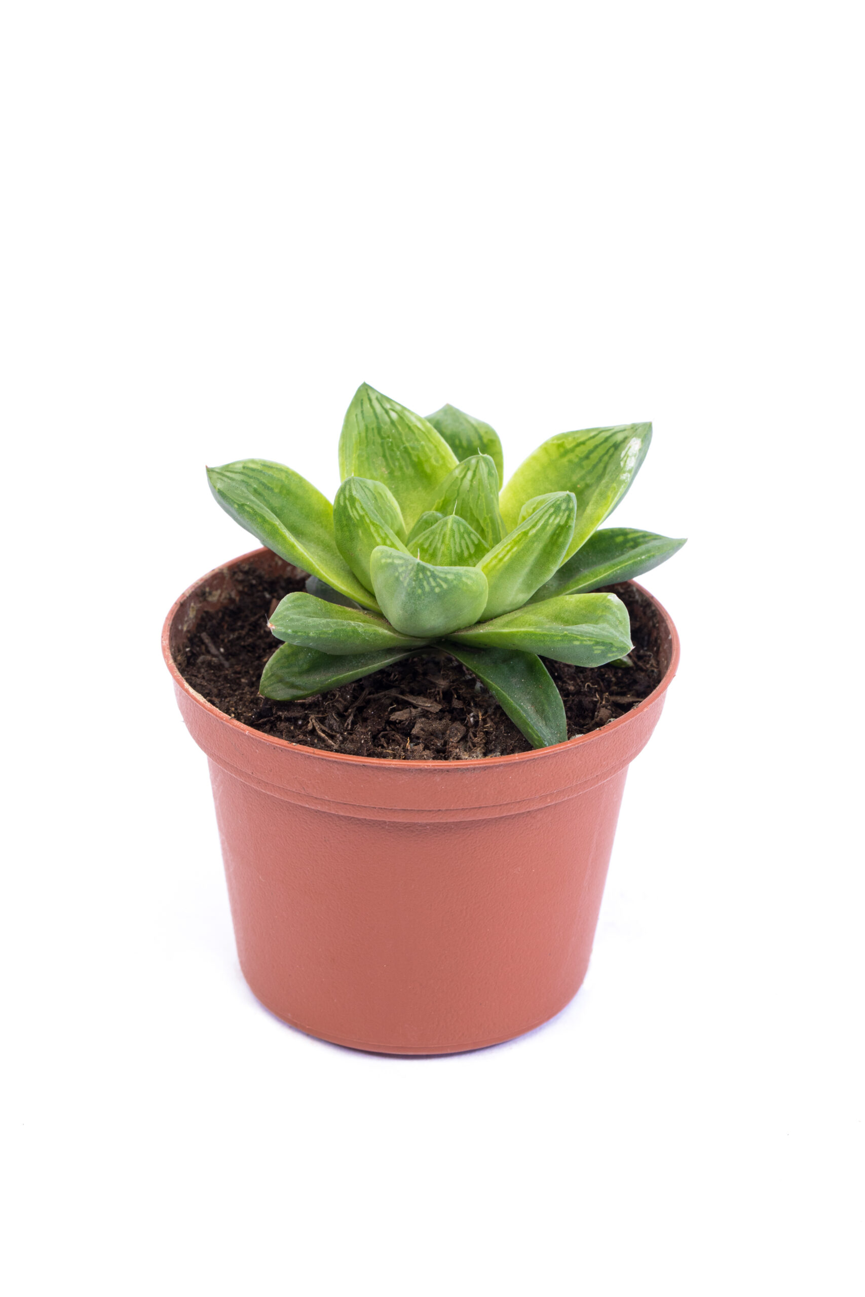An evergreen houseplant with soft, boat-shaped leaves. Sometimes slightly serrated near the tips. Leaves are green, bluish-green to greenish-grey, yellowish-green, turning yellow or orange-red in full sun. White or very pale pink blooms with brownish-green veins.